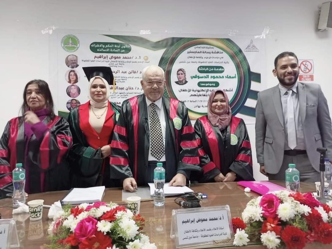 تم مناقشة الرسالة بكلية دراسات الطفولة بجامعة عين شمس وكان عنوانها (اشكال الألعاب الالكترونية للأطفال وعلاقتهم بتفاعليتهم )