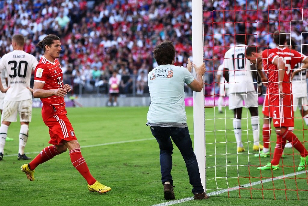 و بعد مرور نحو 17 دقيقة على بداية المباراة المقامة بملعب أليانز أرينا، اقتحم مشجع أرض الملعب وقام بربط نفسه في القائم الأيسر.