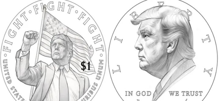 ويُظهر أحد التصاميم صورة لترامب على الوجه الأول للعملة النقدية، بينما يحمل الوجه الثاني صورة أخرى له رافعا قبضته أمام علم أميركي مع عبارة “حارب حارب حارب”.