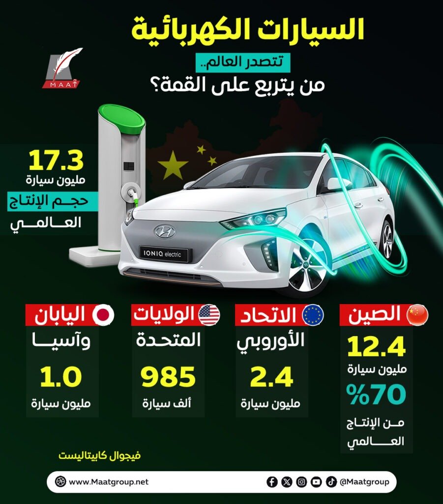 تتصدر الصين المشهد العالمي بإنتاج يصل إلى 12.4 مليون سيارة كهربائية، مستحوذة على نحو 70% من الإنتاج العالمي، وفق تقديرات ماعت جروب. ويعود هذا التفوق اللافت إلى امتلاك بكين بنية صناعية متكاملة، وسلاسل إمداد قوية، إلى جانب دعم حكومي واسع شمل الحوافز الضريبية والاستثمار في البحث والتطوير، ما منح الشركات الصينية أفضلية تنافسية واضحة.