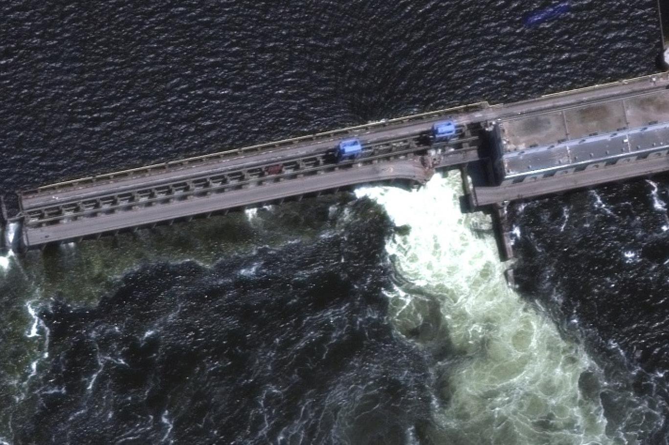 ونشر مقطع فيديو لطائرة بدون طيار يظهر تدفق طوفان من المياه من ثقب كبير في سد نوفا كاخوفكا في منطقة خيرسون شرق أوكرانيا.