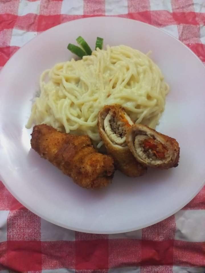 نفرد البانيه ونضع فيه الحشو ونلف البانيه رول ويتم تثبيته بخله أسنان وتم وضعه قطعه البانيه الملفوف في بقسماط مطحون وندوس عليه من جميع الاتجاه ثم يتم تسويته في زيت مغلي غزير