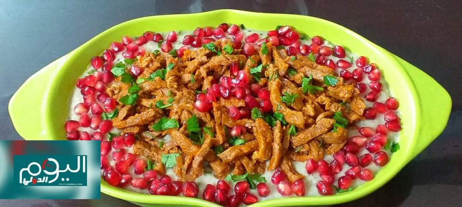 فى سرفيس التقديم هنحط خليط الباذنجان وفوقه قطع اللحم ونزينه بحبات الرمان ويتقدم
