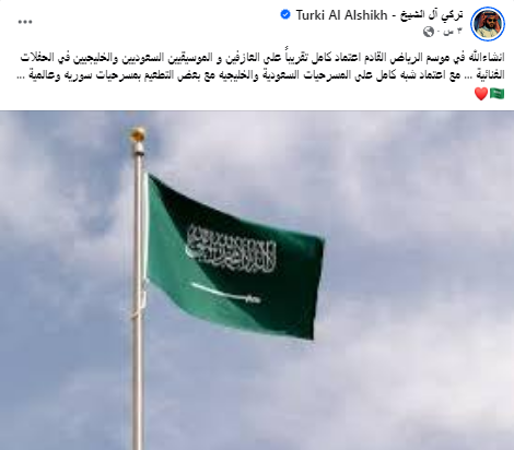 فى قرار مفاجىء لرئيس الهيئة العامة للترفيه في السعودية المستشار تركى ال الشيخ أن موسم الرياض القادم سيعتمد بشكل كلى على الكوادر الموسيقية والمسرحية السعودية والخليجية، مع مشاركة محدودة لأعمال سورية وعالمية، دون أي ذكر للمشاركة المصرية التي ظلت حاضرة بقوة في المشهد الفني السعودى من اول ما بدات فعالياتة.