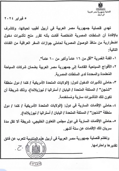 أعلنت قنصلية جمهورية مصر العربية في أربيل، مساء اليوم الإثنين، أن السلطات المصرية، قررت منح تأشيرات الدخول الاضطراري، من منافذ الوصول المصرية، لحاملي جوازات السفر العراقية، لخمس فئات، وهو ما لاقى ترحيبا كبيرا داخل العراق وخاصة إقليم كردستان.