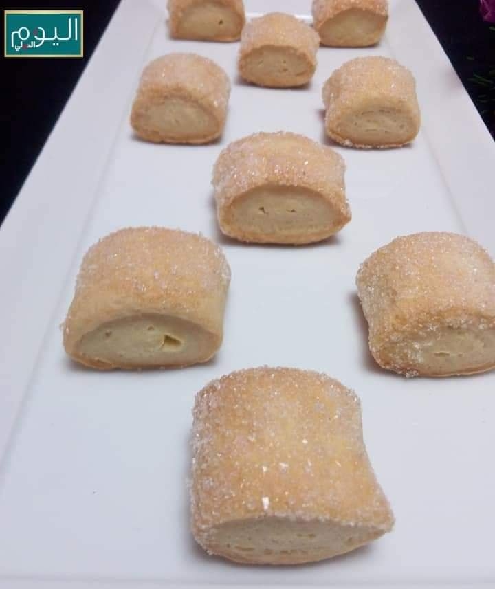 نعفر الطاولة بالدقيق و نفردها مستطيل و تلف رول و تغلق الحواف و تقطع وحدات حوالى ٣ سم نضعها من الوجه في السكر و ترص في صاج على ورق زبدة و تخبز ١٨٠