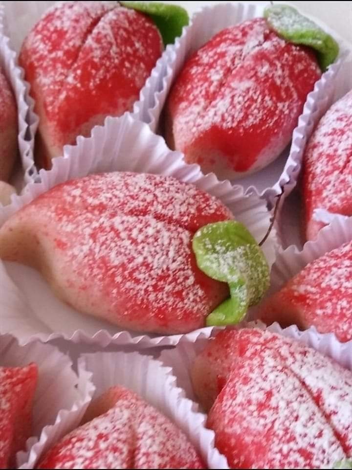 تم ناخذ العجينة لوز نذخل الحشواونغلقها تمام ثم نشكلها على شكل حبة خوخ كما هي موضحة في الصورة تم ناخذ ملون غذائيّ احمر نرش به الخوخةونزينه باوراق عجينة السكرا الجاهزة