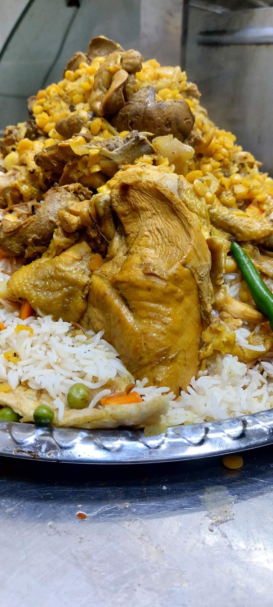 يغسل الدجاج جيدا ب الملح والخل يحمر البصل ويضاف ورق الغار والثوم واللومي والهيل يضاف الكبد يحمر نضيف الدجاج ثم الحمص والبطاطس المبشوره ويضاف الكركم يقلب ثم يضاف ماء الطبخ ويضاف الملح