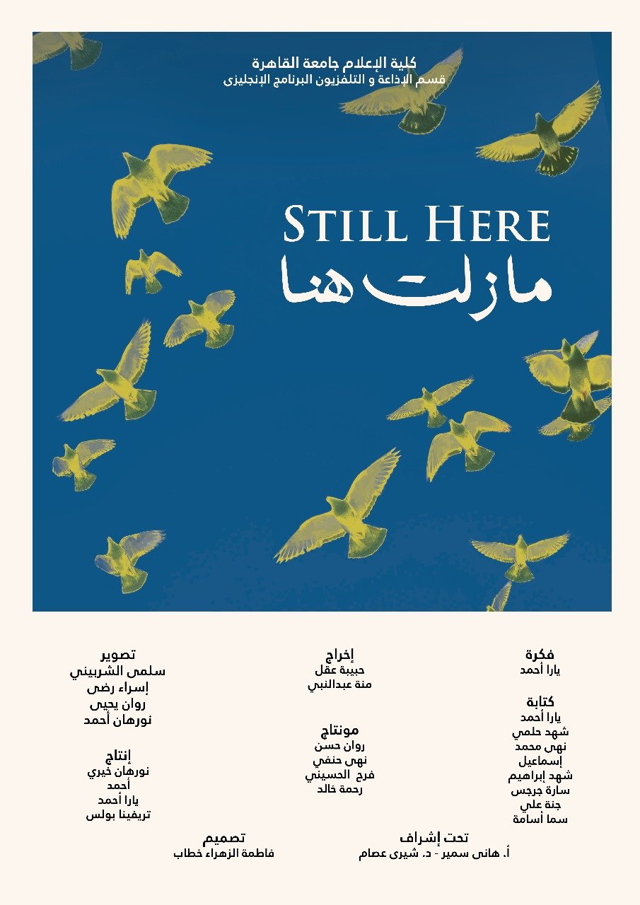 عرض طلاب كلية الإعلام- قسم اللغة الإنجليزية – شعبة الإذاعة والتلفزيون بجامعة القاهرة- الفرقة الرابعة مشروع تخرجهم في صورة فيلم تسجيلي يوم السبت الموافق ١٠ مايو ٢٠٢٥ والذي كان عنوانه (مازلتُ هنا)، محاولين إيصال صوت من لا صوت لهم من الأطفال والمراهقين الذين يعيشون في دور للرعاية التابعة للدولة والذين نبذتهم أسرهم وتشردوا في الطرقات بكل ما تحملها لهم من قسوة ومخاطر وأيضاً إنحرافات مؤكدة، او ممن تعرضوا لحالات العنف الأسري او ممن فقدوا الوالدين وتشردوا، ليتم دخولهم ضمن برنامج رعاية توفره لهم تلك الدور، ويشمل الإقامة والتعليم والمأكل والمشرب وممارسة الرياضة والرعاية الصحية والإشراف علي جميع شئونهم لخلق مواطن صالح وتأهيلة للتعامل مع العالم الخارجي وهو حاملاً إما شهادتة وإما صنعتة.