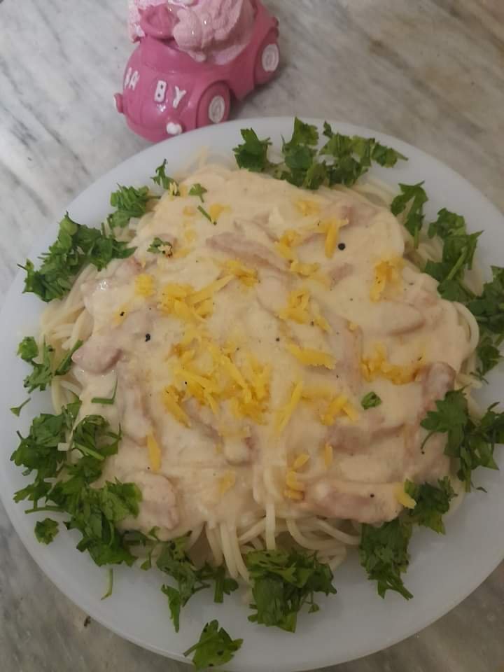 وفي اناء علي النار ننزل بالزبدة والزيت واول ما يسخنو نضع عليهم الفراخ المتقطع وننزل عليهم بالملح والفلفل الاسود والتوم المفروم ونشوحهم لمدة ٥ دقايق وبعدين نرفع الفراخ في طبق علي جمب وفي نفس الاناء ننزل بباقي التوم ونقلبه جيدا لمدة دقتين ثم ننزل بالكريمه الطهي والجبنة الموتزريلا لحد ما الخليط يبدأ بالغليان يوضع عليه الفراخ تاني ونسيبهم يغلو مع بعض لمده ٣او ٤ دقايق وبعد كده نعرف المكرونه في الأطباق ونوزع عليهم الفراخ وكريمه الطهي ونزينها ببقدونس وجبنه مبشورة او حسب الرغبه ونقدمها