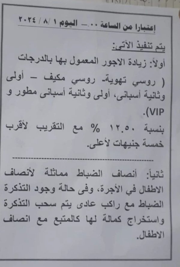 -اما فيما يخص قطارات تالجو الإسبانية على خط الصعيد استمرار صرف تذاكر الدرجة الأولى والثانية لقطارات التالجو بدون زيادة رسمية.